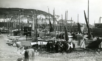 Old photograph - bringing the boat ashore - Mousehole people.